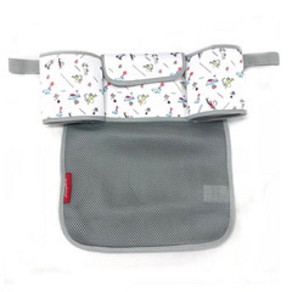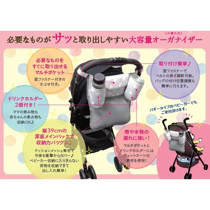 ベビーカーに簡単装着で荷物を収納できるアンジェレッテのベビーカーオーガナイザーです。